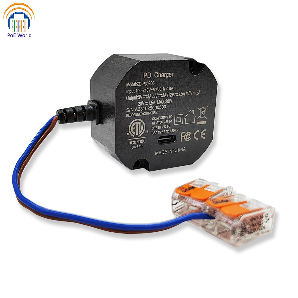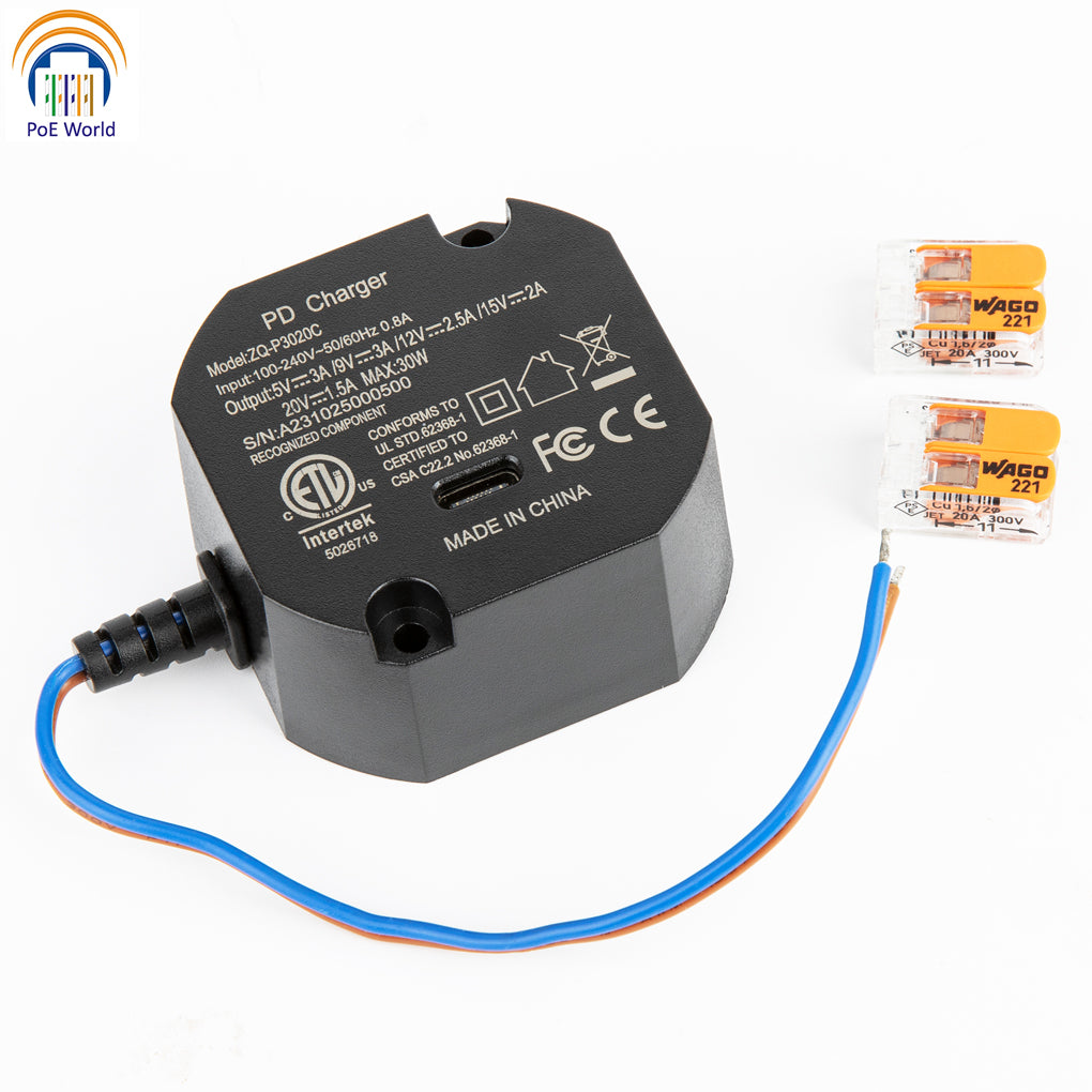 NEW! 30W AC to USBC Adapter Flush Wall-mounted Power Supply 100 to 240 VAC to 5-20VAC with 30W Max Output Type-C Charger for Tablets