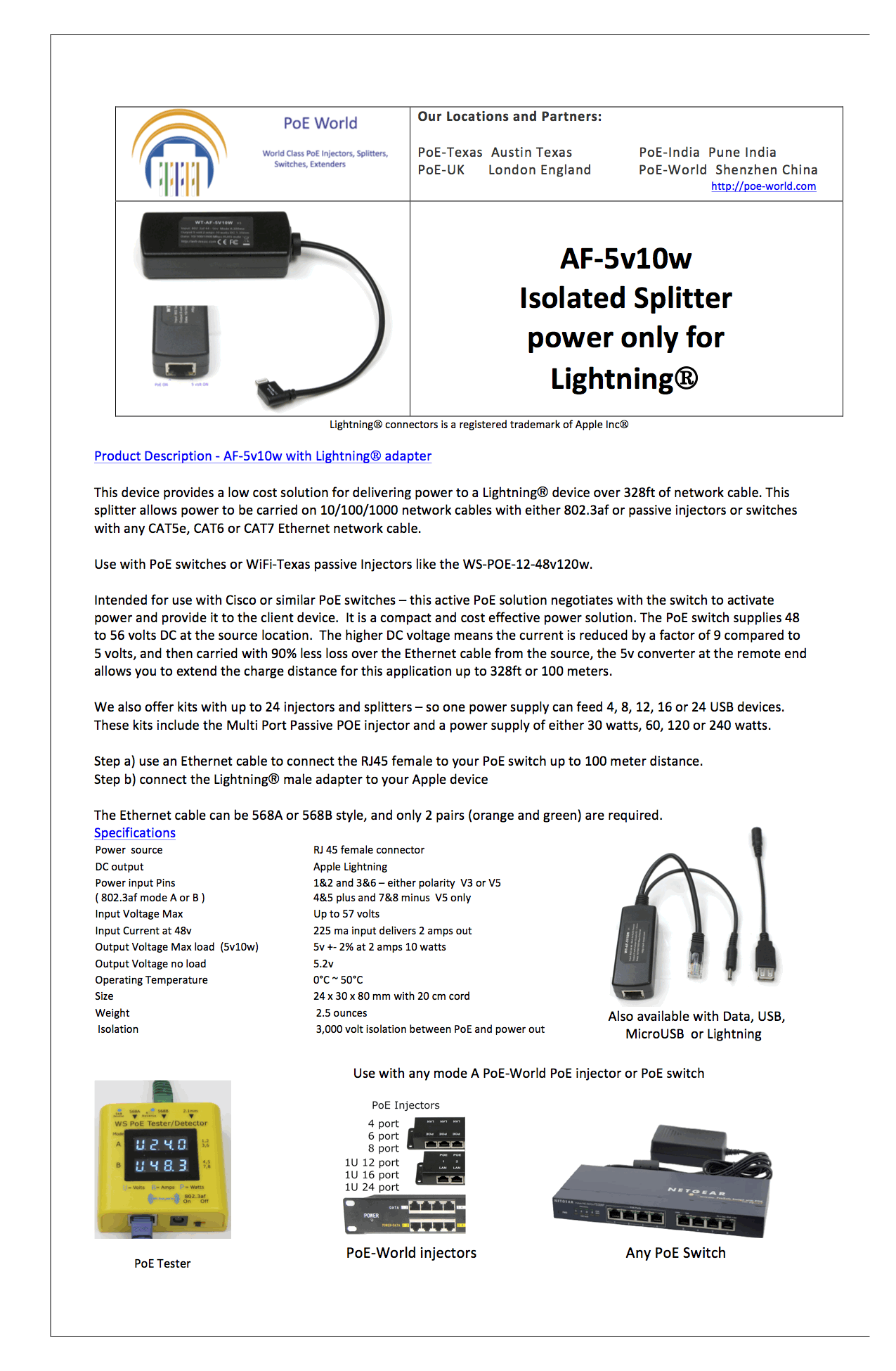 AF-5V10W-Lightning 5 Volt 10 Watt Lightning splitter / 802.3af PoE to 5 Volt Splitter for Lightning Devices (Power Only)