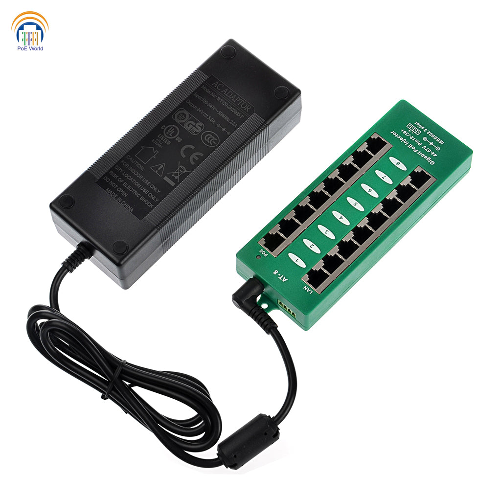 8 port Gigabit PoE+ auto negotiating injector with 56 volt 120 watt power supply