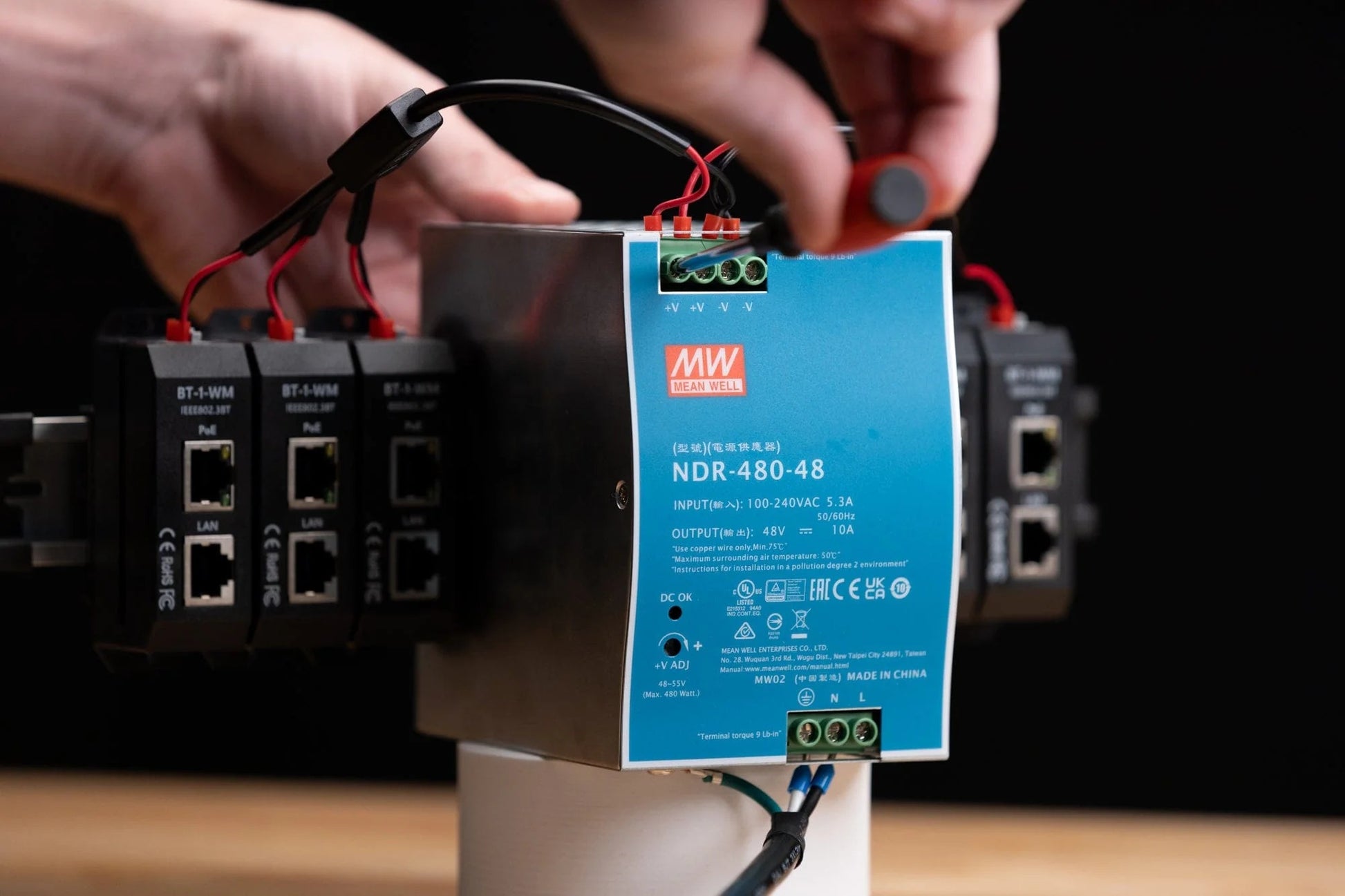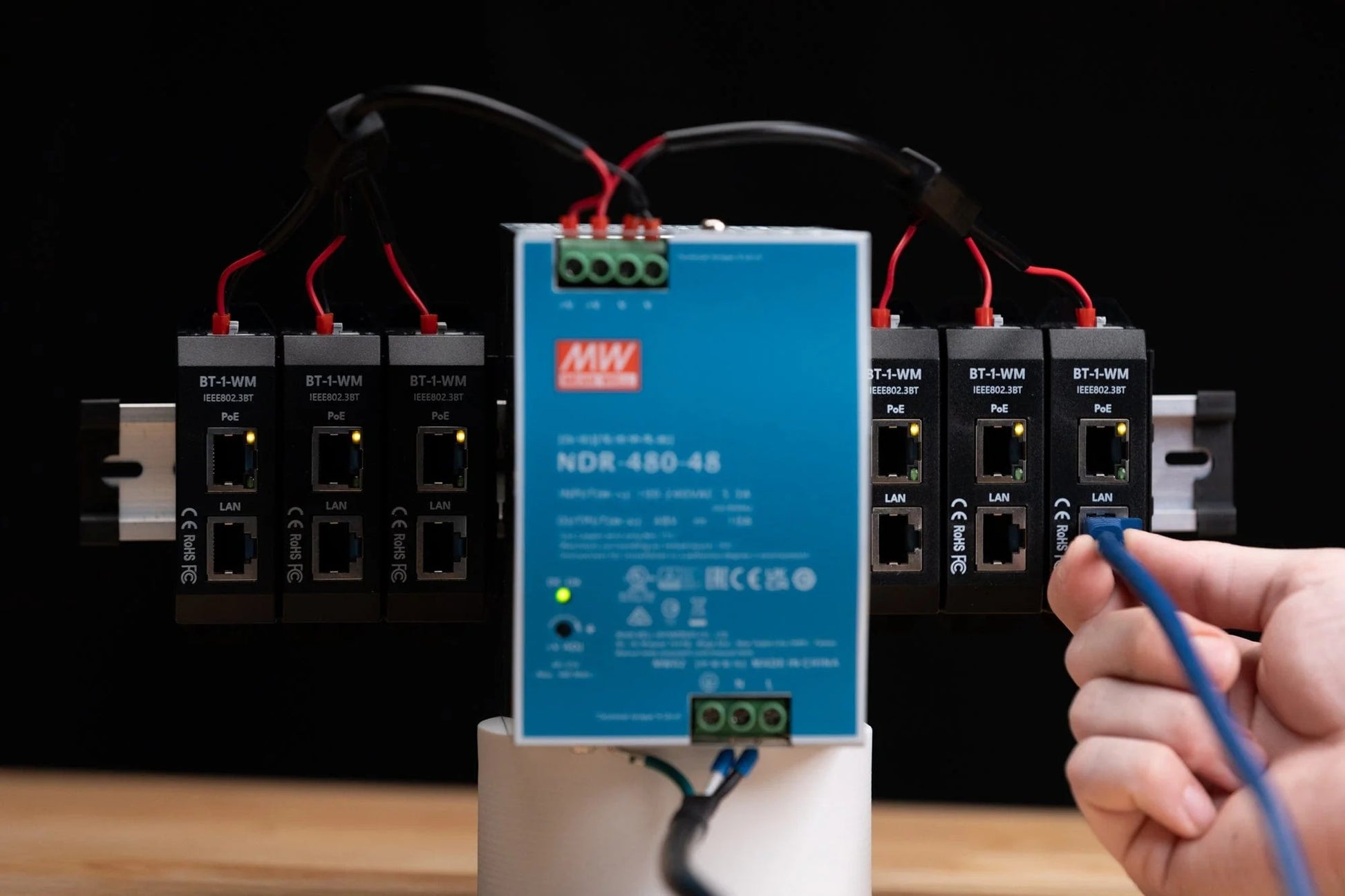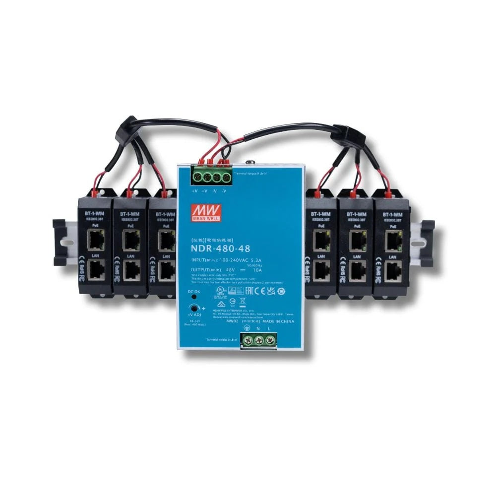 This kit includes six modular BT-1-WM injectors, a 480W adjustable power supply (48–56V), and DIN rail mounting hardware. Its compact, efficient design allows easy installation in control cabinets, racks, or walls, giving you flexibility in deployment. The injectors support IEEE 802.3af/at/bt standards with active PoE negotiation and dual-mode output (Mode A/B).