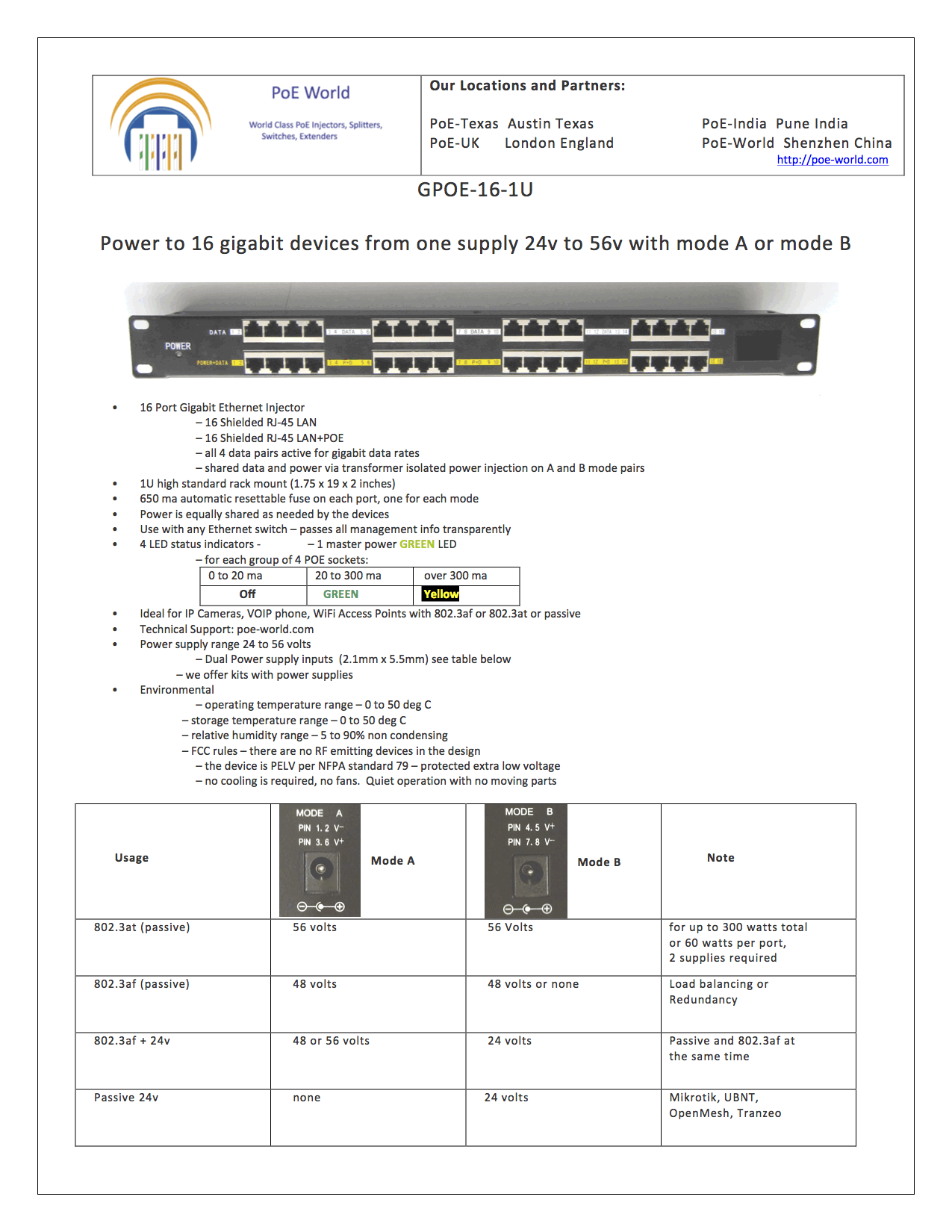 This rack mountable 16 port Gigabit midspan injector is able to provide PoE power and data for 16 devices for up to 100 meters . Use this injector to power IP cameras, VoIP phones, access points, and more. This injector operates on mode A and B and power is “always on”.