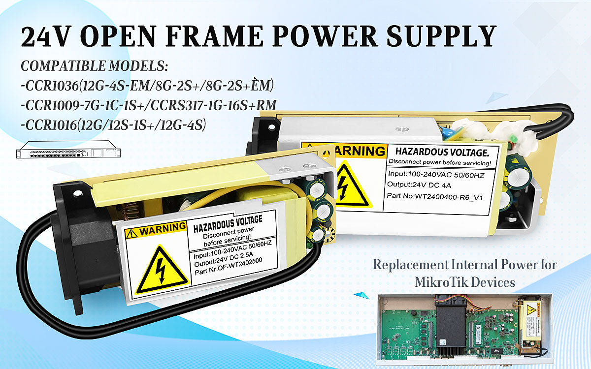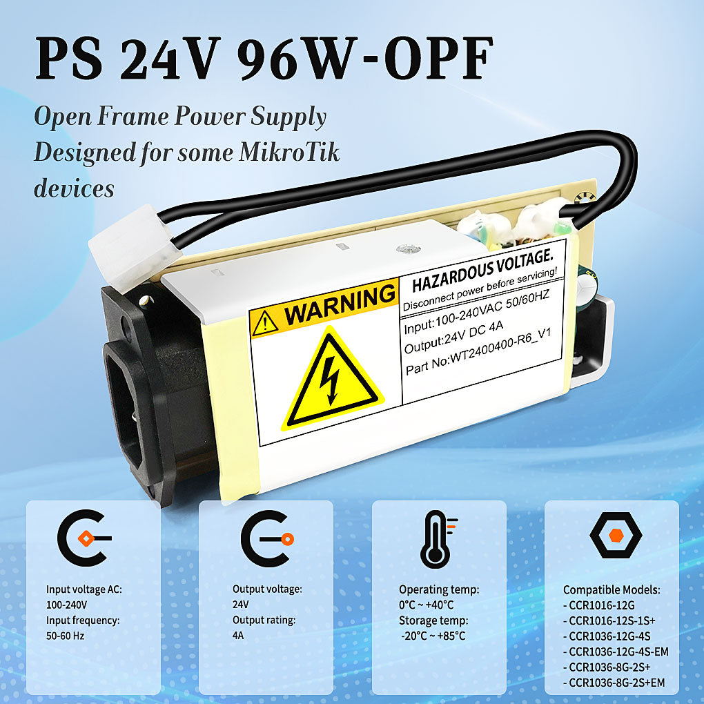 The PS24V96W-OPF is a 96W replacement internal power supply designed for MikroTik CCR1016 and CCR1036 series routers. It ensures stable and reliable power delivery, making it an ideal replacement for damaged or faulty power supplies.